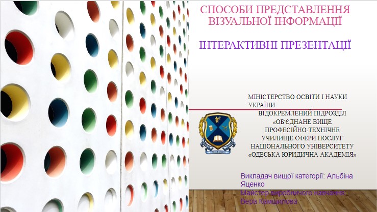 До уваги учасників вебінару була представлена презентація «Способи представлення візуальної інформації. Інтерактивні презентації». З доповіддю виступили Яценко Альбіна Юріївна, викладач спецдисциплін та Камшилова Віра Григорівна, майстер виробничого навчання Відокремленого підрозділу «Об’єднане вище професійно-технічне училище сфери послуг Національного університету «Одеська юридична академія».