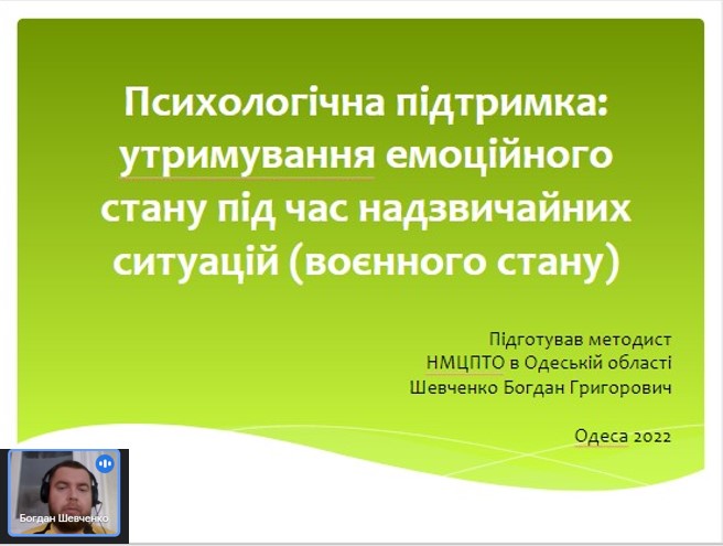 На завершення, щоб підтримати емоційний та психологічний дух учасників вебінару та використати презентацію у роботі, виступив Шевченко Богдан Григорович, методист кабінету організаційно-методичної, кадрової та виховної роботи НМЦ ПТО в Одеській області. Тема його доповіді: «Психологічна підтримка: утримання емоційного стану під час надзвичайних ситуацій (воєнного стану)».