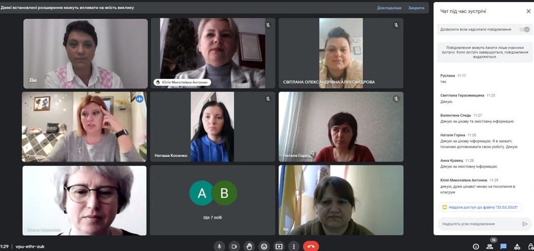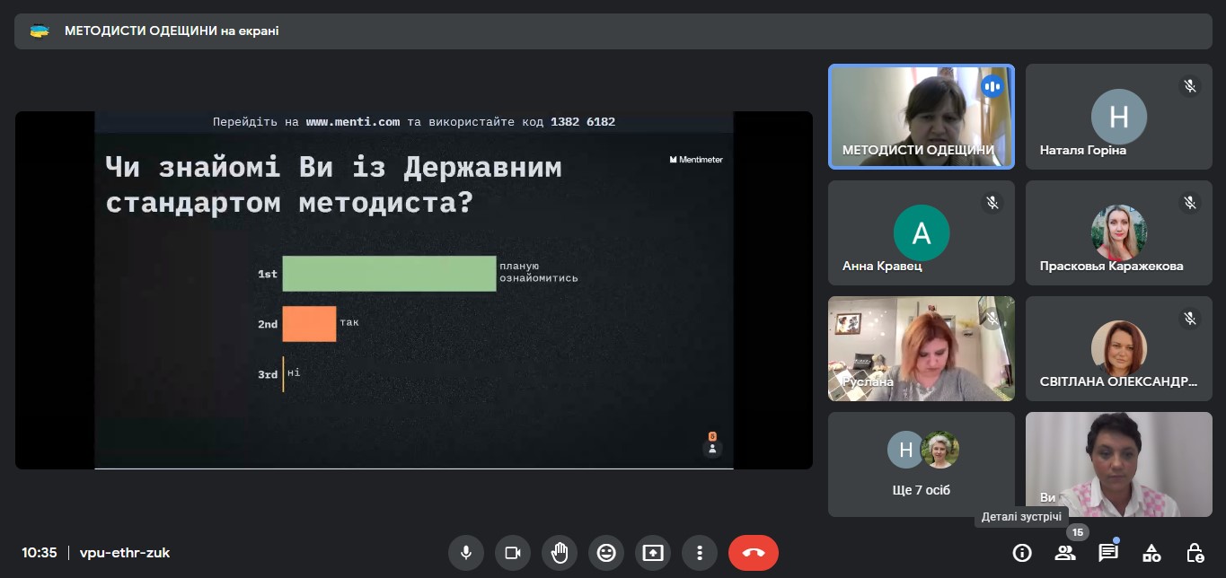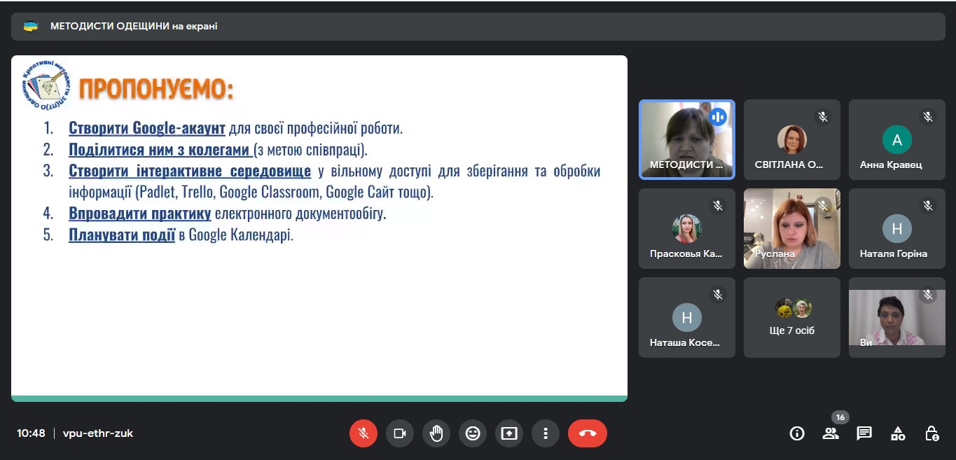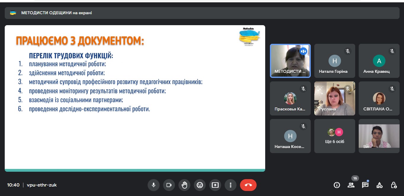 Учасники засідання новопризначені методисти, заступники директорів із навчально-методичної (навчальної, методичної) роботи, які тільки розпочали свою діяльність (стаж роботи до трьох років) та ті, що потребують методичної допомоги, ознайомилися з нормативно-правовим забезпеченням методичної робити; оговорили питання складання організаційних, розпорядчих, довідково-інформаційних документів з організації методичної роботи; окреслили основні напрями роботи педагогічної ради, методичних (циклових) комісій, інструктивно-методичних нарад у закладі професійної (професійно-технічної) освіти; тощо. Також обговорили як організувати роботу за допомогою хмарних сервісів Google, як створити інтерактивне середовище у вільному доступі для зберігання та обробки інформації (Padlet, Trello, Google Classroom, Google Сайт тощо), як впровадити практику електронного документообігу, планувати події в Google Календарі.