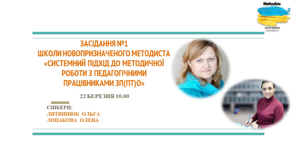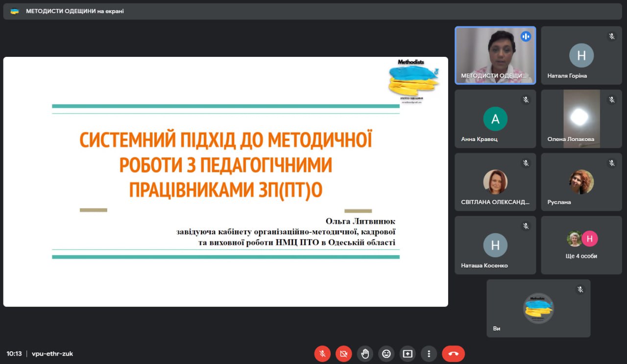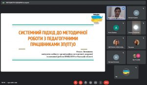 22 березня 2023 року відбулося перше онлайн засідання школи новопризначеного методиста за темою «Системний підхід до методичної роботи з педагогічними працівниками закладів професійної (професійно-технічної) світи». Спікери заходу: Ольга Литвинюк, завідуюча кабінету організаційно-методичної, кадрової та виховної роботи НМЦ ПТО в Одеській області та Олена Лопакова, голова методичного об’єднання методистів Одеської області, методист ДНЗ «Одеський професійний ліцей сфери послуг Південноукраїнського національного педагогічного університету імені К.Д. Ушинського».