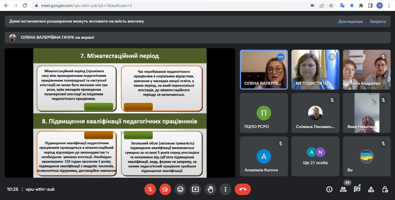 Спікери розкрили питання щодо організації та проведення чергової та позачергової атестації; порядку присвоєння кваліфікаційних категорій та педагогічних звань; атестації окремих категорій педагогів. Окреслили осучаснені введення щодо створення, складу та повноважень атестаційних комісій; порядку проведення атестації; оскарження рішень атестаційної комісії.