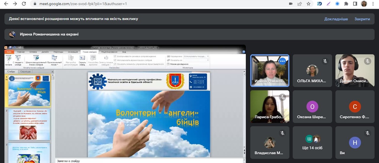 У презентації «Волонтери – янголи добра» Ірина Романчишина, методистка НМЦ ПТО в Одеській області розповіла про кращі молодіжні ініціативи та здійснені доброчинні заходи в ЗП(ПТ)О Одеської області.