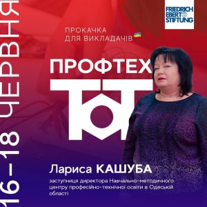 Захід відбувся в рамках триденного тренінгу “Профтех ТоТ: тренінг для викладачів закладів професійно – технічної освіти”, який проходить в м. Одеса з 16 по 18 червня 2023 року. Від Одеської області у тренінгу беруть участь 6 педагогів ЗП(ПТ)О, які будуть ділитися напрацьованими інструментами у своїх закладах освіти.