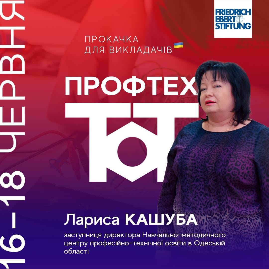 Лариса Кашуба виступила в якості спікера на дискусійній панелі «Профтех в часи невизначеності: рушійна сила у відновленні України». Основною темою дискусії стало обговорення нагальних питань забезпечення навчального процесу та опрацювання змін у професійній освіті. Під час цієї дискусійної панелі учасники також мали можливість ознайомитися із закордонним досвідом для профтеху.