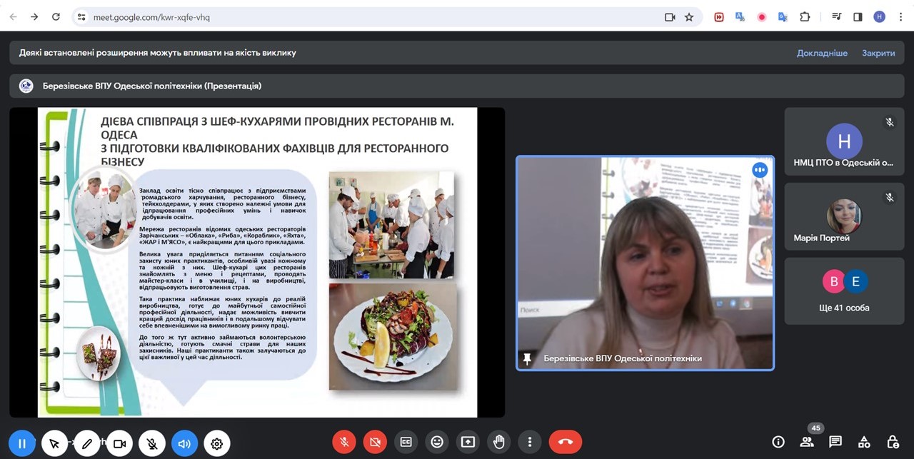 Осадчук Наталія Петрівна, викладач спецдисциплін, майстер виробничого навчання ВСП «Березівське вище професійне училище НУ «Одеська політехніка» продемонструвала популяризацію традиційних українських та світових кухонь у професійно – практичній підготовці кваліфікованих робітників та яку роль відіграє соціальне партнерство на якість підготовки.