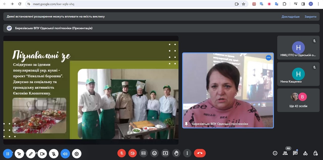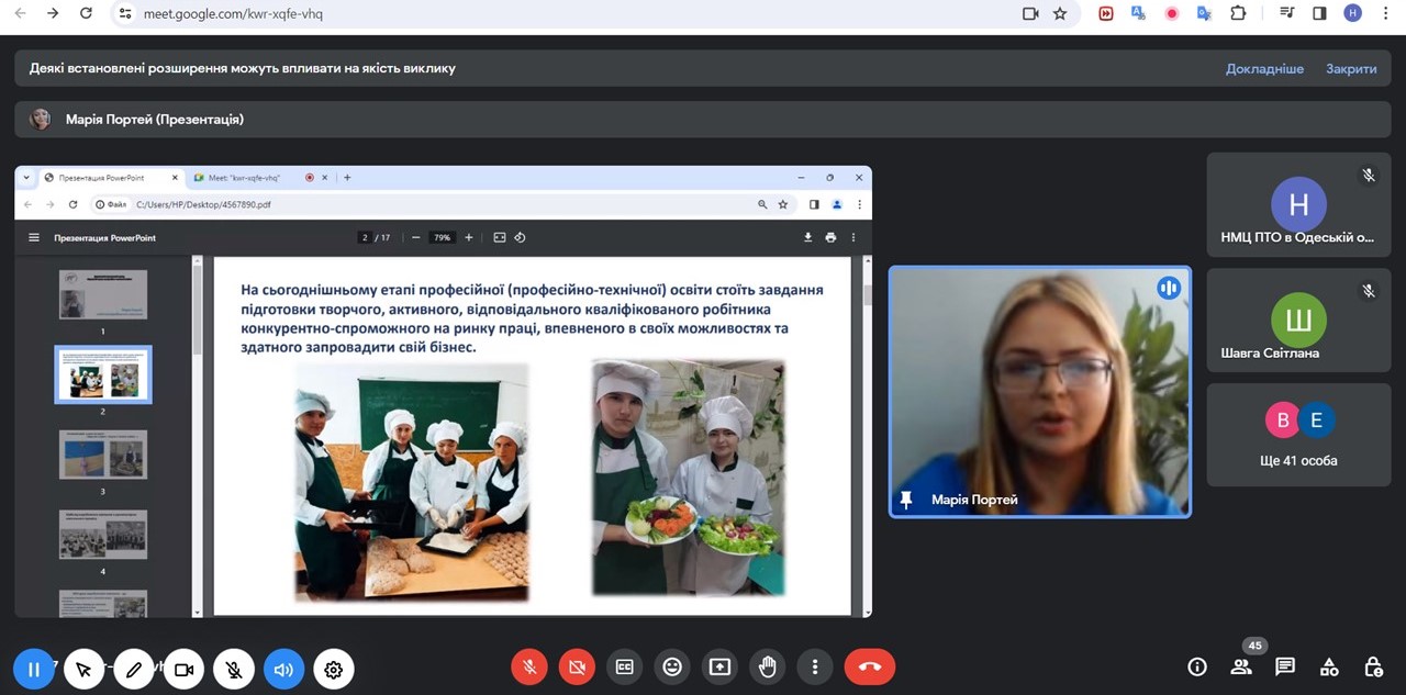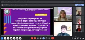 Засідання проводилось у формі онлайн-вебінару на тему: «Соціальне партнерство як основна форма взаємодії закладів професійної (професійно-технічної) освіти з роботодавцями у процесі підготовки кваліфікованих робітників професій торгівлі та громадського харчування».