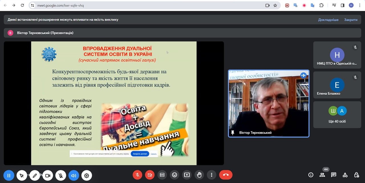 Відкрила вебінар та привітала учасників засідання координатор заходу, методист Навчально-методичного центру професійно – технічної освіти Шавга Світлана Вікторівна, яка ознайомила учасників з результатами моніторингових досліджень, які проводились методичною службою НМЦ ПТО в Одеській області з впровадження дуальної форми навчання у навчально-виробничий процес.