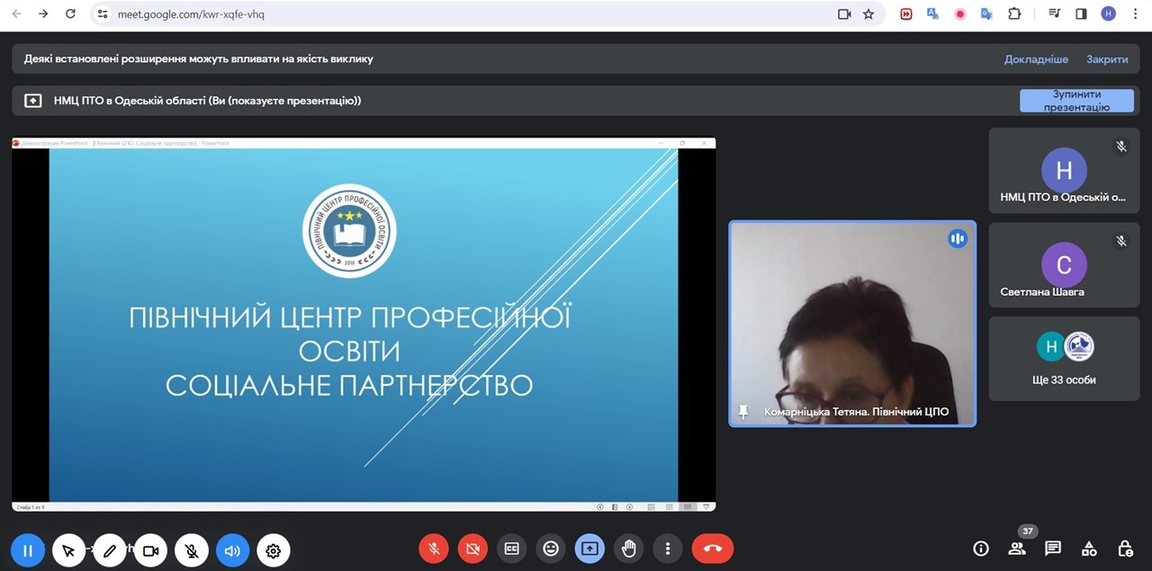 Сучасний досвід соціального партнерства у професійній освіти висвітлила у своїй презентації та відеороликах Комарніцька Тетяна Анатоліївна, викладач спецдисциплін Північного центру професійної освіти. Та робота, яку проводять у закладі освіти та поза межами закладу педагогічні працівники, здобувачі освіти на підтримку народу та Збройних Сил України служить достойним прикладом та всілякої поваги.