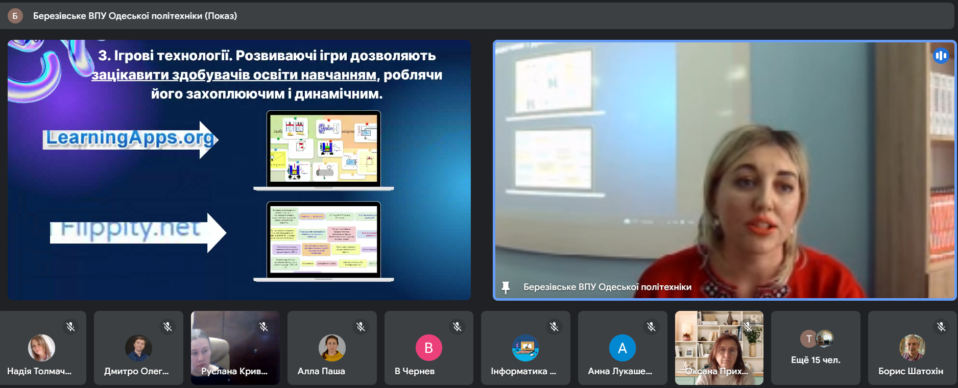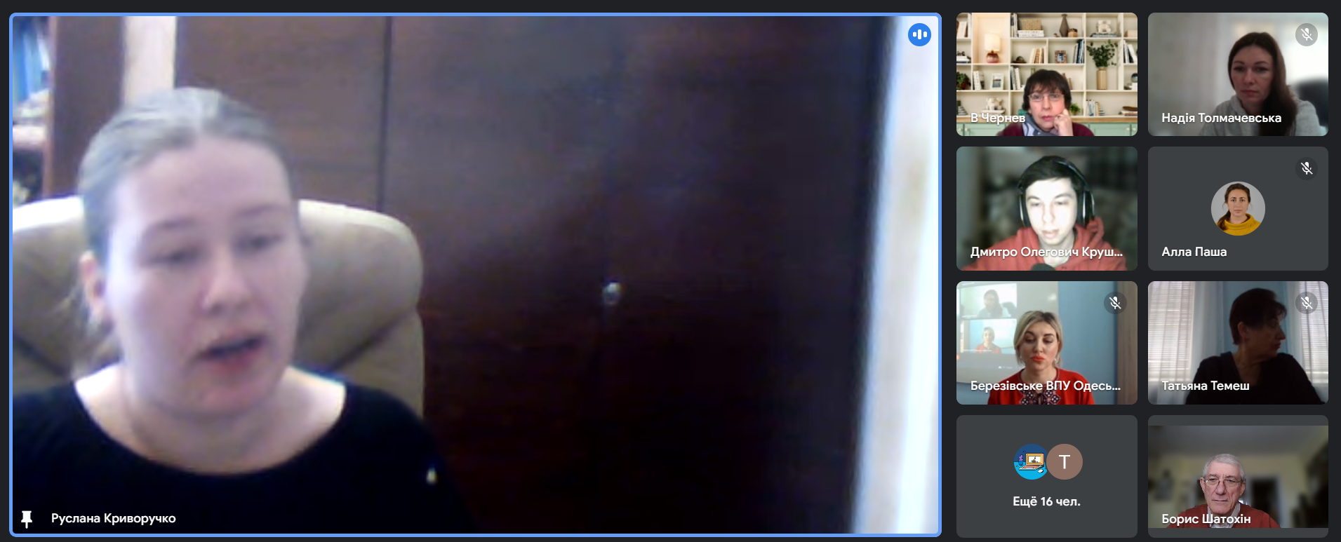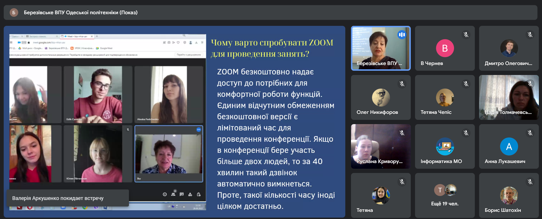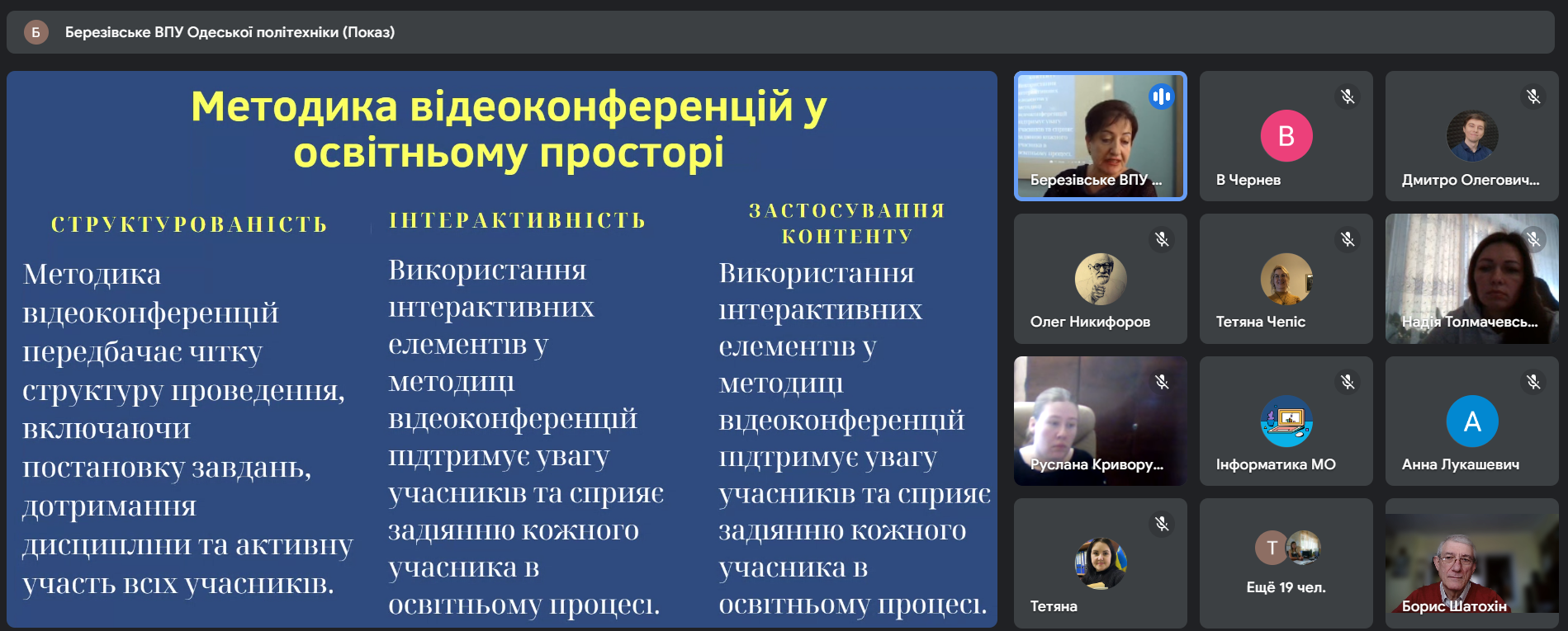 Спікери заходу ділилися з учасниками власними методичними прийомами, як максимально використовувати можливості відеоконференцій при проведенні освітнього процесу.