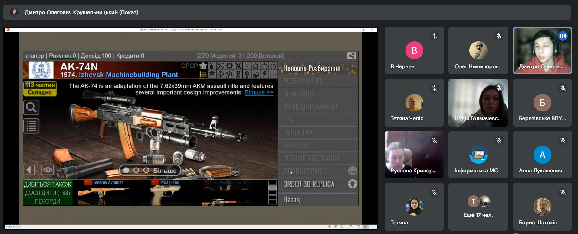 Крушельницький Дмитро Олегович, викладач предмета «Захист України» ДНЗ «Одеський професійний ліцей будівництва та архітектури», у своїй презентації розповів про проблеми дистанційного навчання та способи їх вирішення шляхом активізації пізнавальної діяльності здобувачів освіти у навчальному процесі, навівши приклад використання додатка World of Guns: Gun Disassembly у навчальному процесі. Використовуючи даний додаток, можна влаштовувати різні змагання із віртуального розбирання та збирання конкретної моделі зброї, а також створити таблицю лідерів, що буде спонукати до змагання між здобувачами освіти.