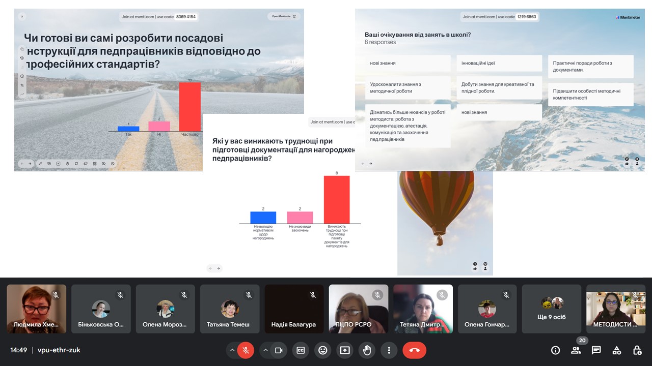 З метою більш ефективної організації роботи Школи у ході засідання, серед учасників, проведено опитування в додатку Mentimeter. Педагоги обміркували які виникають труднощі при підготовці документації для нагороджень педпрацівників, чи готові самі розробити посадові інструкції для педпрацівників відповідно до професійних стандартів, поділилися очікуваннями від занять в Школі.