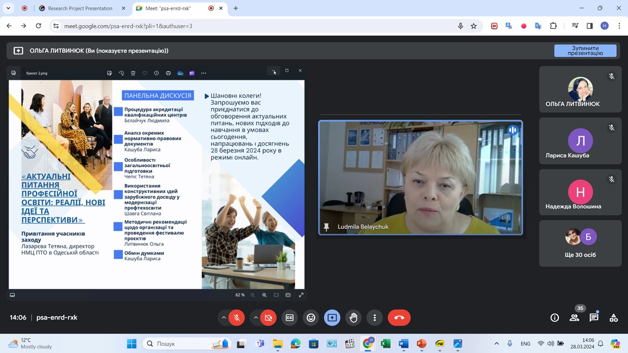 Ольга Литвинюк, завідувачка кабінету організаційно-методичної, кадрової та виховної роботи Навчально-методичного центру професійно-технічної освіти в Одеській області, зосередила увагу на регіональних формах представлення та поширення кращого досвіду педагогічних працівників. Обговорила питання організації та проведення обласного «Фестивалю педагогічних інновацій».
