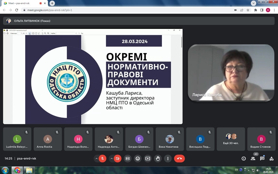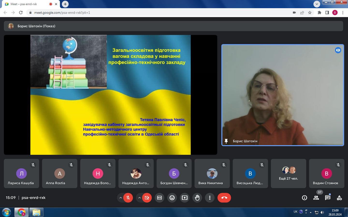 Тетяна Чепіс, завідувачка кабінету загальноосвітньої підготовки Навчально-методичного центру професійно-технічної освіти в Одеській області, зосередила увагу учасників наради на особливостях загальноосвітньої підготовки у 2023-2024 н.р.