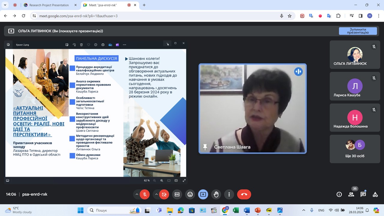 Використання конструктивних ідей зарубіжного досвіду у модернізації профтехосвіти презентувала Світлана Шавга, методист кабінету професійної підготовки Навчально-методичного центру професійно-технічної освіти в Одеській області. Поділилася враженнями та набутими знаннями від участі в навчальному семінарі на тему «Методологія компетентнісно-орієнтованого оцінювання та практика її застосування в країнах ЄС: шляхи та напрями інтеграції в українську сферу освіти», який відбувся з 12 по 15 березня 2024 року в місті Афіни (Греція).