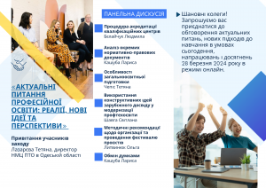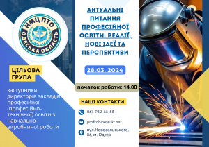 28 березня 2024 року Навчально-методичним центром професійно-технічної освіти в Одеській області проведено обласний семінар-нараду для заступників директорів з навчально-виробничої роботи ЗП(ПТ)О на тему «Актуальні питання професійної освіти: реалії, нові ідеї та перспективи».