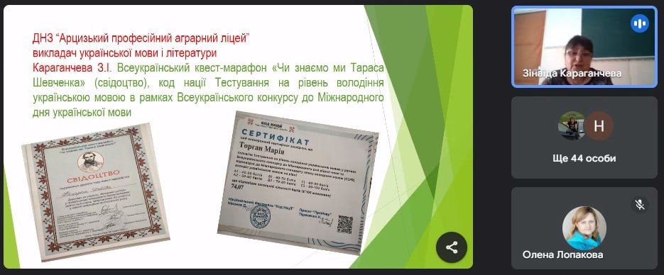 Привітала учасників заходу Соколюк Світлана, методист кабінету загальноосвітньої підготовки НМЦ ПТО в Одеській області та поінформувала про результати моніторингу вхідного зрізу знань здобувачів освіти першого курсу та моніторингу першого семестру здобувачів освіти. Також поінформувала про переможців ІІІ (ІІ) (обласного) етапу ХІV Міжнародного мовно-літературного конкурсу учнівської та студентської молоді імені Тараса Шевченка, ІІІ (ІІ) (обласного) етапу XХІV Міжнародного конкурсу з української мови імені Петра Яцика. Зачитала наказ МОН України від 26.03.2024 №398 «Про нагородження переможців XIV Міжнародного мовно-літературного конкурсу учнівської та студентської молоді ім. Т.Шевченка, де наша здобувачка освіти Плюйко Аліна Олександрівна здобула ДИПЛОМ ІІІ СТУПЕНЯ (фінальний етап). Гордимося і щиро дякуємо талановитій здобувачці освіти та викладачу Чмільовій Наталії Сергіївні за достойне представлення Одещини. Нехай ця ПЕРЕМОГА стане стимулом для нових великих звершень і досягнень, мотиватором для участі у нових конкурсах та змаганнях!
