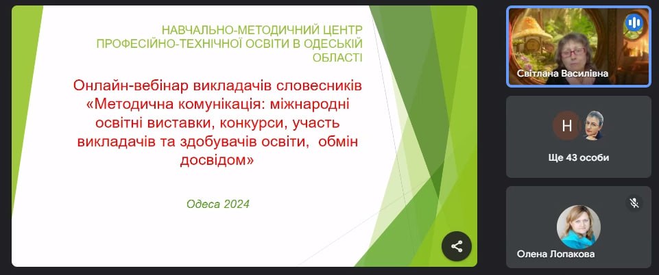 Відповідно до річного плану роботи НМЦ ПТО в Одеській області 30 квітня 2024 року відбувся вебінар викладачів словесників закладів професійної (професійно-технічної) освіти на тему «Професійно вдосконалюємось: «Методична комунікація: міжнародні освітні виставки, конкурси, участь викладачів та здобувачів освіти, обмін досвідом».