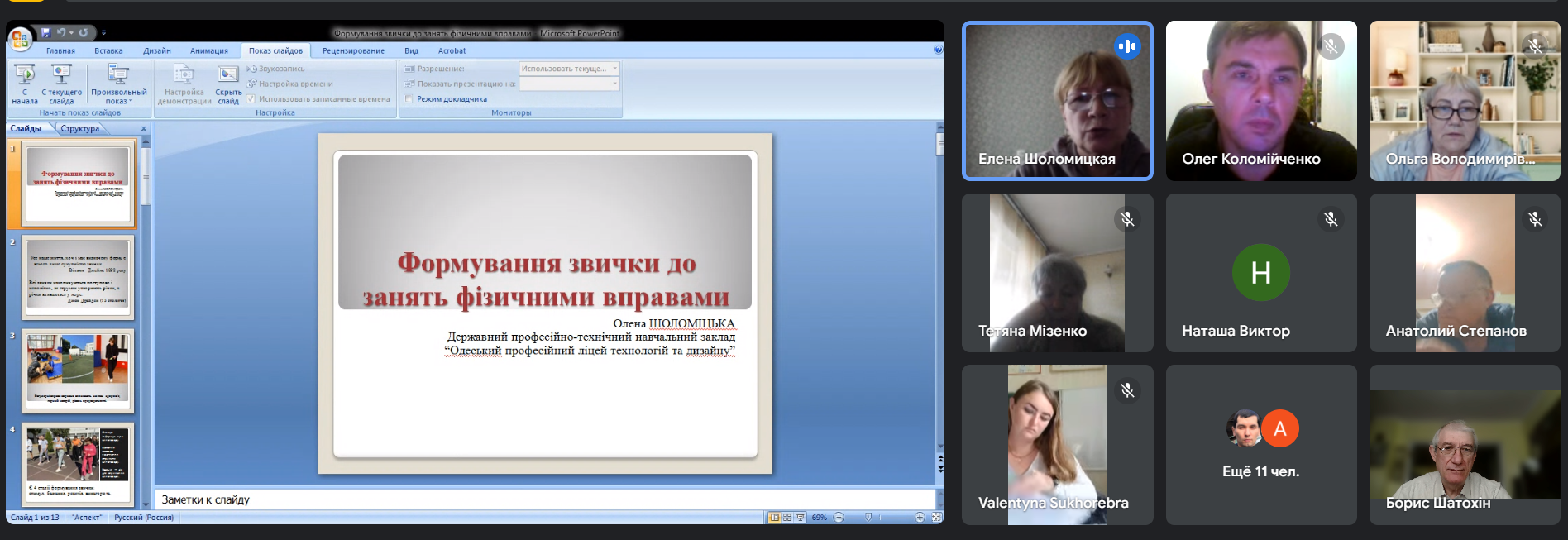 Шоломіцька Олена Миколаївна, викладач фізичної культури ДПТНЗ «Одеський професійний ліцей технологій та дизайну», говорила, які методики вона пропонує для формування звички до занять фізичними вправами. Розкрила 4 стадії формування звички, а саме: «стимул, бажання, реакція, винагорода». І пояснила, чому якщо будь-яка з 4 стадій не працює, звичка не сформується, Головними спортивними досягненнями закладу у цьому навчальному році були І місце у відбірковому обласному фіналі Всеукраїнського фізкультурно-оздоровчого заходу «Козацька ліга» та ІІІ місце у змаганнях шашок «CHECKERS TOURNAMENT» серед студентської та учнівської молоді Одещини.