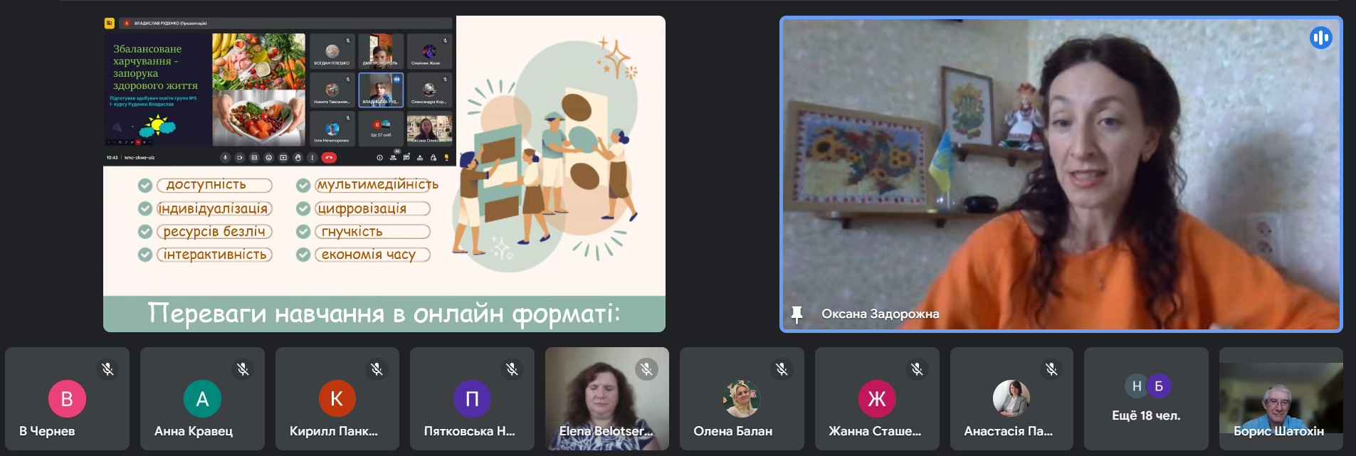 Задорожна Оксана Олександрівна, викладач фізики і астрономії ДНЗ «Одеський центр професійно-технічної освіти», розповіла про переваги онлайн-формату взаємодії зі здобувачами освіти для впровадження проєктної педагогічної технології. У виступі вона говорила про прерогативи, виділила основні характеристики проектної технології навчання, етапи проектної діяльності, про аспекти онлайн-проектів (комунікація, інструменти, менеджмент, оцінка та рефлексія). Також відмітила, як багато користі можна отримати від поєднання онлайн та офлайн видів навчання.
