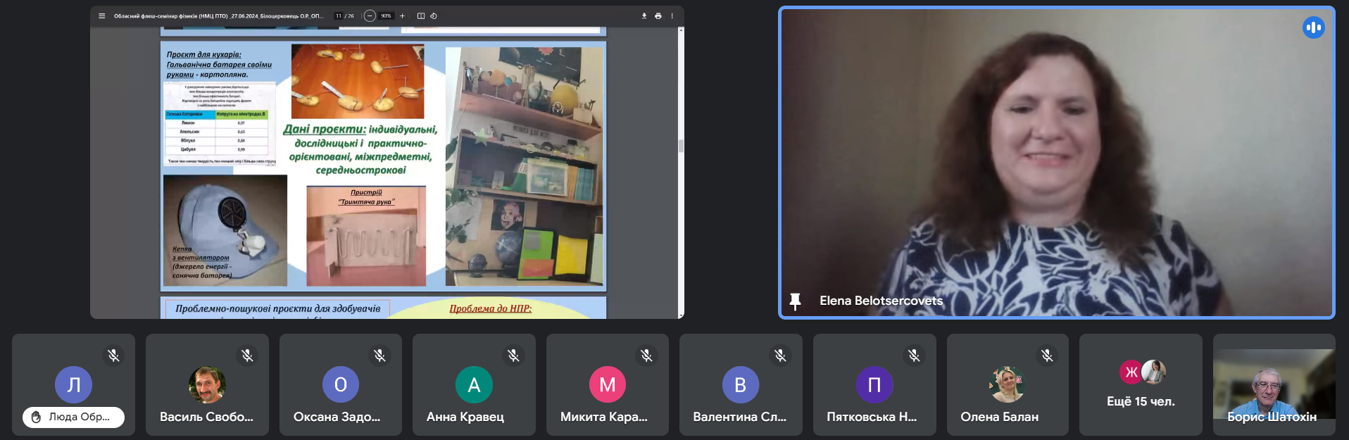 Білоцерковець Олена Романівна, викладач фізики і астрономії ДНЗ «Одеський професійний ліцей морського транспорту» говорила про проєкти як засіб реалізації пізнавальної активності і розвитку творчих здібностей здобувачів освіти на уроках фізики і астрономії. Виступ був дуже ґрунтовним. Проаналізувала види, типи проектів. Продемонструвала алгоритм роботи від планування проекту до демонстрації результату виконання проекту. При роботі над проектами здобувачі освіти заповнюють паспорт проекту, матрицю проекту, це дисциплінує та підвищує відповідальність за результат роботи.