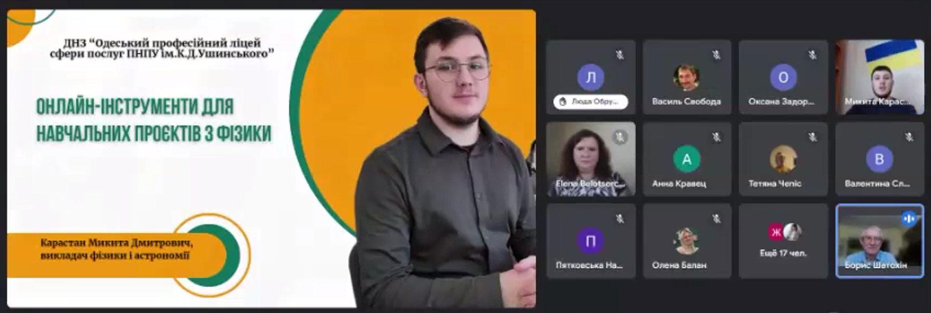 Карастан Микита Дмитрович, викладач фізики і астрономії ДНЗ «Одеський професійний ліцей сфери послуг Південноукраїнського національного педагогічного університету імені К.Д. Ушинського» розповів про «Онлайн-інструменти для навчальних проєктів з фізики», які використовує у своїй роботі.