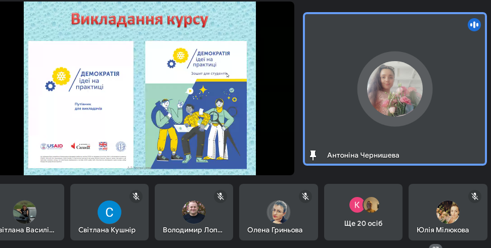 Антоніна Чернишева, викладач громадянської освіти ДНЗ «Одеське вище професійне училище автомобільного транспорту» поділилася інформацією впровадження пілотного курсу з громадянської освіти «Демократія ідеї на практиці» для професійних професійно-технічних навчальних закладів.
