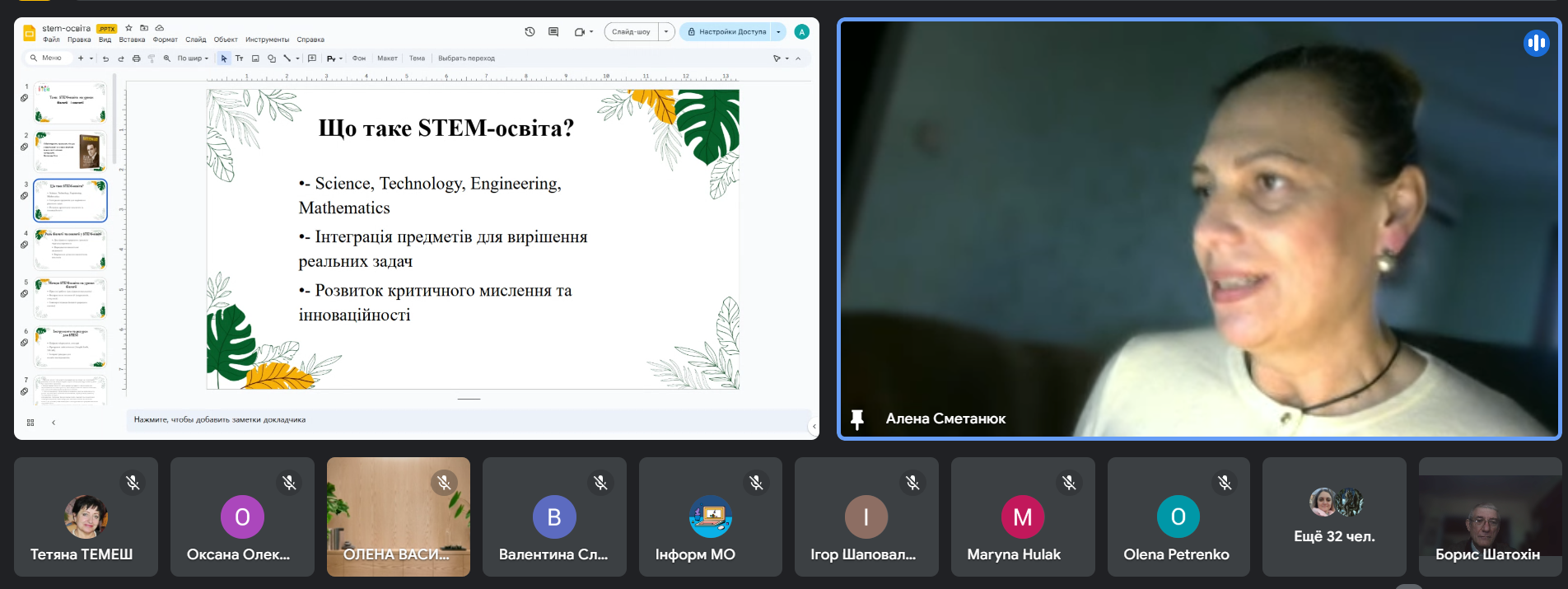 Сметанюк Алла Володимирівна, викладач біології і екології, хімії ДПТНЗ «Одеський професійний ліцей технологій та дизайну», виступила з темою «STEM-освіта на уроках біології і екології». Було розглянуто практичні аспекти впровадження STEM технологій, які поєднують різні дисципліни для розвитку комплексного мислення учнів.