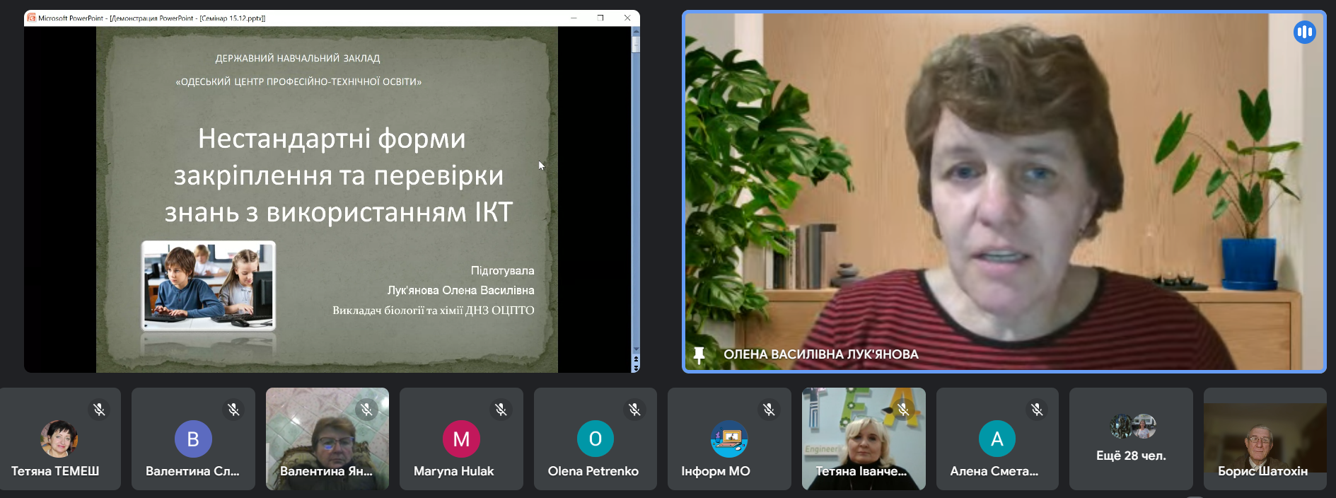Лукʼянова Олена Василівна, викладач хімії та біології і екології ДНЗ «Одеський центр ПТО» «Нестандартні форми закріплення та перевірки знань з використанням ІКТ». Доповідач продемонструвала власні методи використання сучасних онлайн-інструментів (Google Forms, Quizizz, Canva, Edpuzzle).