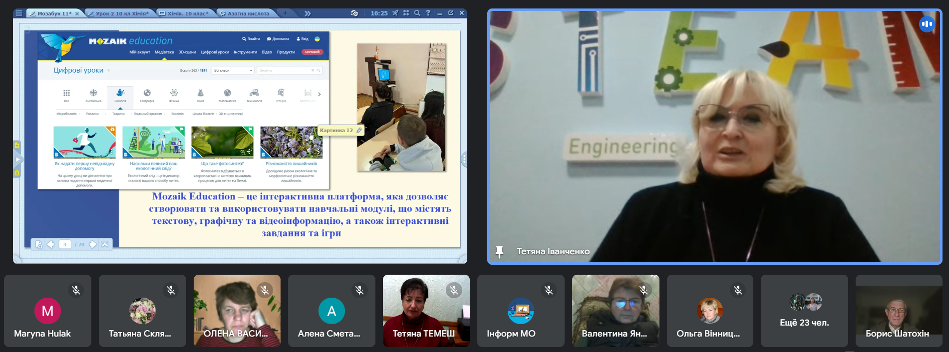 «Сучасні освітні технології, орієнтовані на розвиток особистості здобувачів освіти на уроках природничих дисциплін» – такою була тема доповіді Іванченко Тетяни Олександрівни, викладача хімії ВСП «Березівське вище професійне училище Національного університету «Одеська політехніка». Свій виступ вона присвятила тому, щоб ознайомити колег з MozaiK Education – це інтерактивна платформа, яка дозволяє створювати та використовувати навчальні модулі, шо містять текстову, графічну та відеоінформацію, а також інтерактивні завдання та ігри. MozaiK Education є потужним інструментом для підвищення мотивації здобувачів освіти та забезпечення наочності під час навчання.
