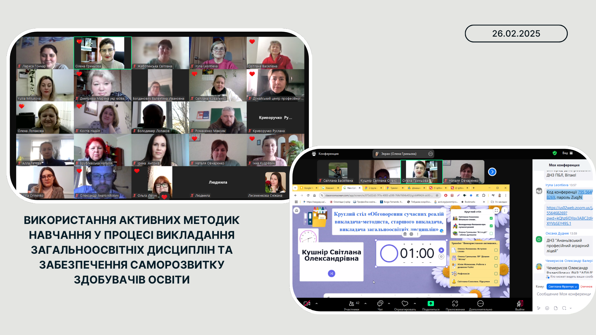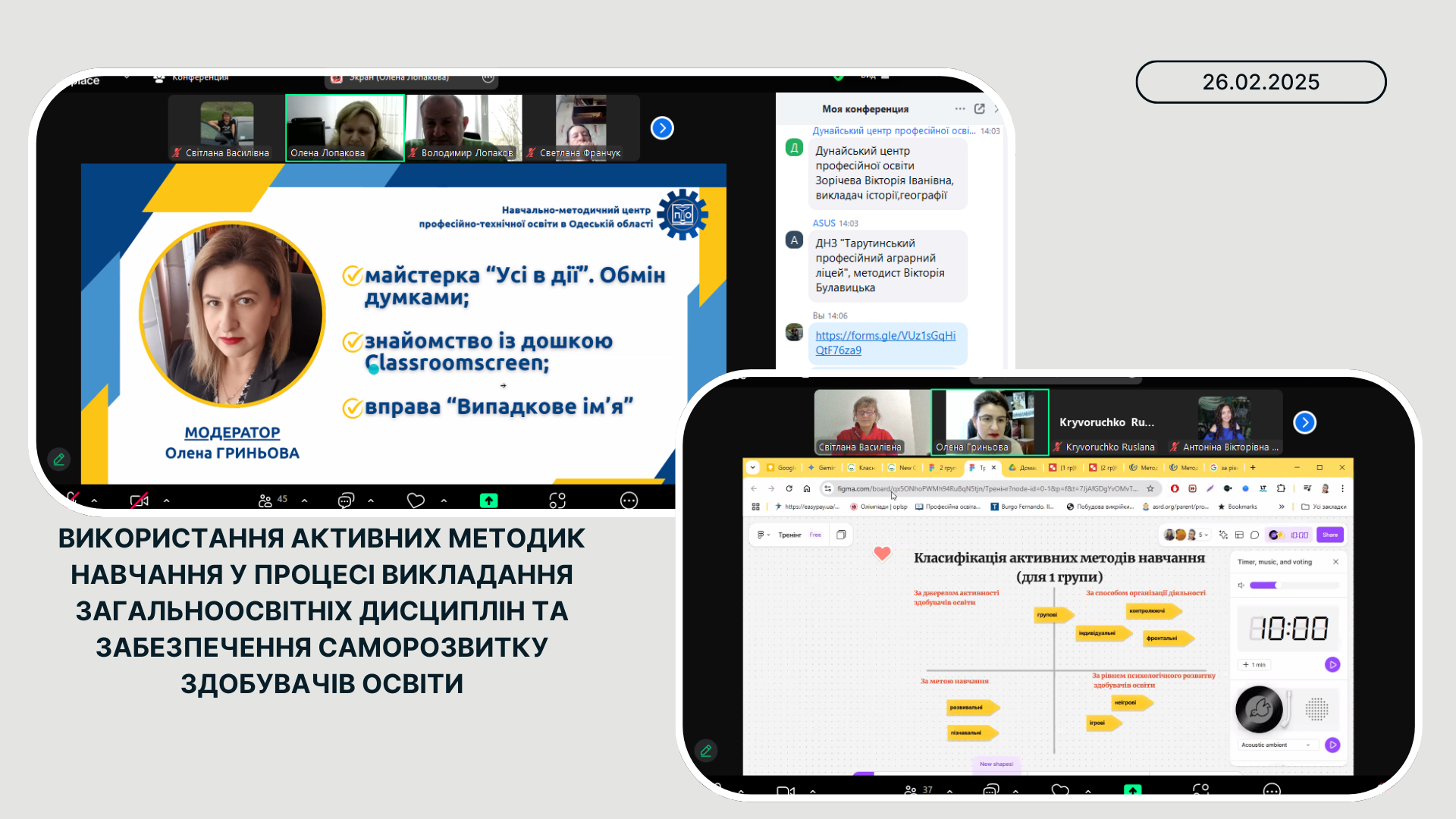 Далі за планом перейшли до тренінгу «Використання активних методик навчання у процесі викладання загальноосвітніх дисциплін та забезпечення саморозвитку здобувачів освіти» Олена Гриньова, голова обласної методичної секції викладачів словесності, викладач української мови та літератури ДНЗ «Одеський професійний ліцей сфери послуг Південноукраїнського національного педагогічного університету ім. К.Д.Ушинського» – модератор практичної роботи. Ознайомила з дошкою Classroomscreen, провела Майстерку «Усі в дії», за допомогою вправи “Випадкове ім’я”, де викладачі мали можливість висловити власну думку щодо використання активних методик навчання.