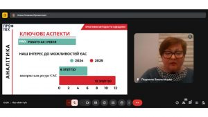 З підсумками аналітичного дослідження «Педагогічні працівники ЗП(ПТ)О Одещини: про педагогічний потенціал; про компетентнісний портрет; про престижність професії та перспективи перебування в ній». Людмила Хмельницька, методист НМЦ ПТО в Одеській області, продемонструвала кількісний та якісний потенціал профтехосвітянської спільноти Одещини. Показала компетентнісний портрет педпрацівників ЗП(ПТ)О, створений на підтаві самооцінювання профтехосвітян щодо власного рівня обізнаності професійного стандарту та його допоміжності. Проаналізувала відношення педагогів до професії та перспективи перебування в ній у найближчі 2 роки.
