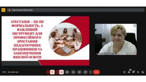 З досвідом роботи атестаційної комісії щодо вивчення атестаційних матеріалів заступника директора ДНЗ «Одеський професійний ліцей сфери послуг Південноукраїнського національного педагогічного університету імені К.Д. Ушинського». Олена Лопакова, голова обласної комісії методистів, методист ДНЗ «Одеський професійний ліцей сфери послуг Південноукраїнського національного педагогічного університету імені К.Д. Ушинського», представила презентацію щодо ключових принципів атестації педагогічних працівників, питань оформлення документів заступників директорів для проходження атестації на відповідність займаній посаді. Дала рекомендації щодо проведення аналізу управлінської діяльності заступника директора ЗП(ПТ)О.