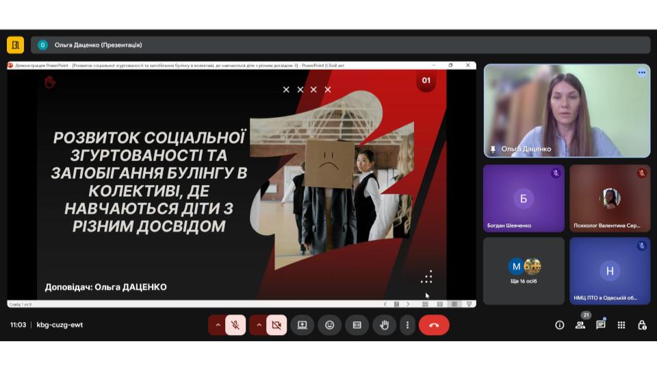 – «Розвиток соціальної згуртованості та запобігання булінгу в колективі, де навчаються діти з різним досвідом». Доповідачка: Даценко Ольга Вадимівна практичний психолог, ДНЗ «Одеський професійний ліцей морського транспорту», поділилася практичними підходами до формування безпечного середовища, розвитку згуртованості та профілактики булінгу. Її досвід — це конкретні кроки до побудови здорового колективу.