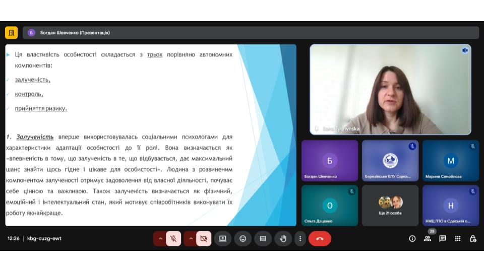 – «Специфіка і методи роботи зі здобувачами освіти в сучасних умовах». Як адаптувати психологічну роботу до реалій сьогодення — війни, нестабільності, емоційного виснаження, і як зберігати довіру та ефективність у взаємодії з підлітками. Доповідачка: Шєфер Валентина Сергіївна – практичний психолог, ДНЗ «Одеський професійний ліцей будівництва та архітектури».