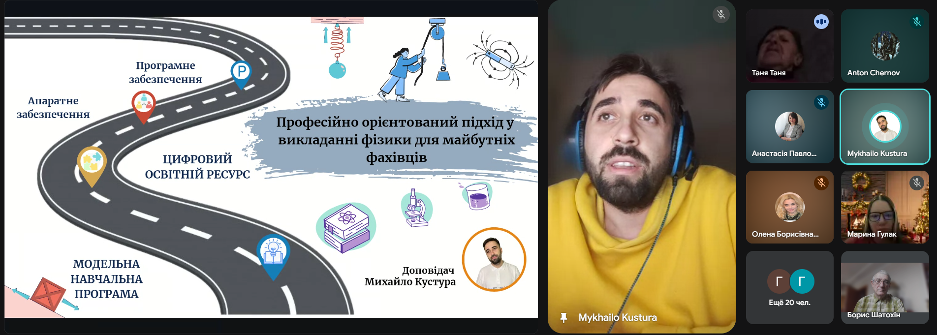 Кустура М.М. виступив із темою: «Професійно орієнтований підхід у викладанні фізики для майбутніх фахівців». Доповідач висвітлив методи та прийоми професійної спрямованості навчання фізики з урахуванням специфіки майбутньої професійної діяльності. Під час виступу він окремо і інформативно доповів, що під егідою МОН та ГО «Фундація Проджектор» працює в групі, яка розробляє та імплементує модельну навчальну програму дисципліни «Цифрові технології і транспортна галузь», а також цифровий програмно-методичний комплекс цієї дисципліни для профільної середньої освіти професійного спрямування за профілем: транспортно-логістична галузь.
