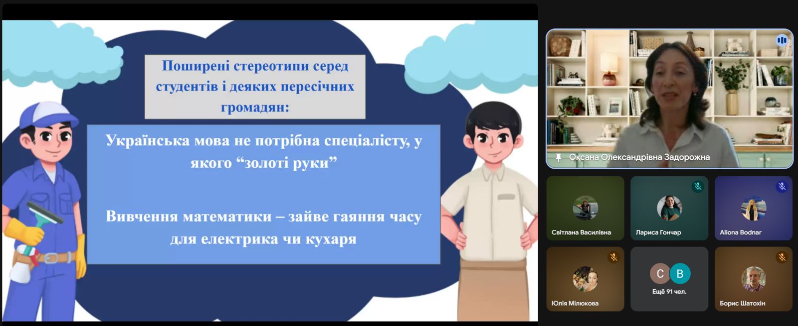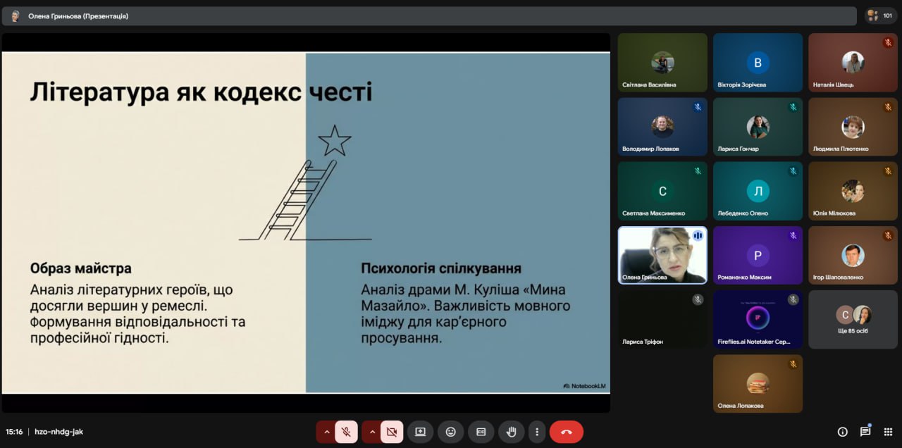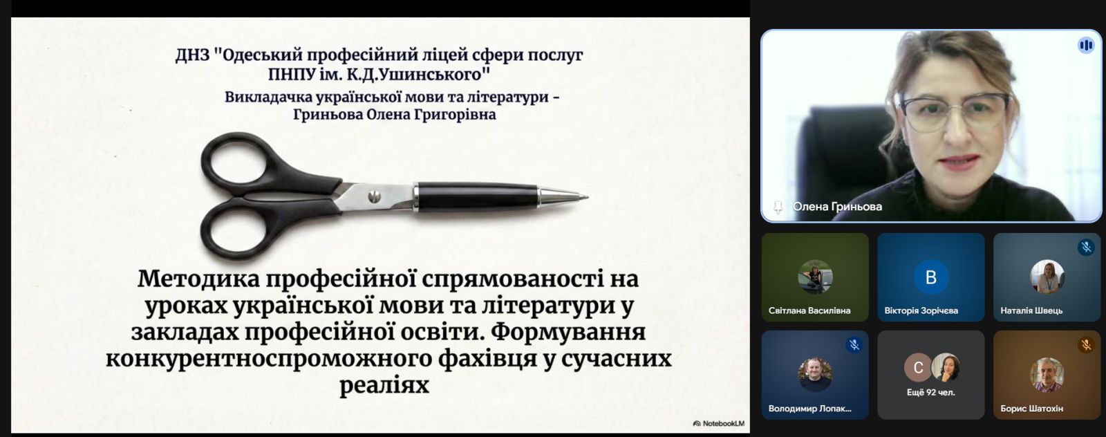 - Словесність з професійним акцентом: Олена Григорівна Гриньова (голова обласної секції викладачів словесності), викладач української мови та літератури презентувала унікальні методики професійної спрямованості у викладанні української мови та літератури.