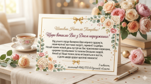 Шановна Наталіє Петрівно! Прийміть наші найтепліші вітання у цей святковий день. Бажаємо Вам міцного здоров’я, безмежного жіночого щастя, нових професійних висот та надійних людей поруч. Нехай у Вашому житті панують мир, гармонія та радість, а кожен день дарує приводи для щирої посмішки. Нехай усі мрії збуваються, а робота приносить лише задоволення та вагомі результати!