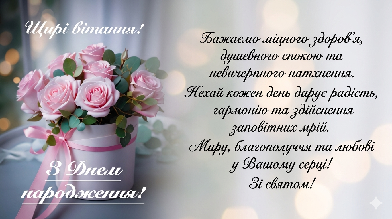 Шановна Людмило Миколаївно! Щиро вітаємо Вас з Днем народження! Нехай у вашому житті завжди буде місце для щоденної радості, цікавих ідей та гармонії. Бажаємо вам міцного здоров’я, спокійних днів, затишку в домі та натхнення у робочих справах. Хай поруч завжди будуть щирі люди, а всі мрії обов’язково здійснюються. Щастя вам та мирного неба!