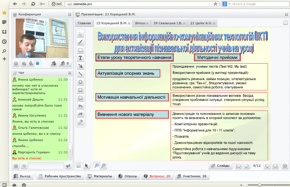 Нажаль через технічні ускладнення викладачі з двох навчальних закладів не змогли взяти участі у вебінарі, але їх доповіді та презентації як і матеріали усіх учасників розміщені на сайті викладачів інформатики та інформаційно-комунікаційних технологій ПТНЗ Одеської області (http://informatik-ptnz.inf.ua/).