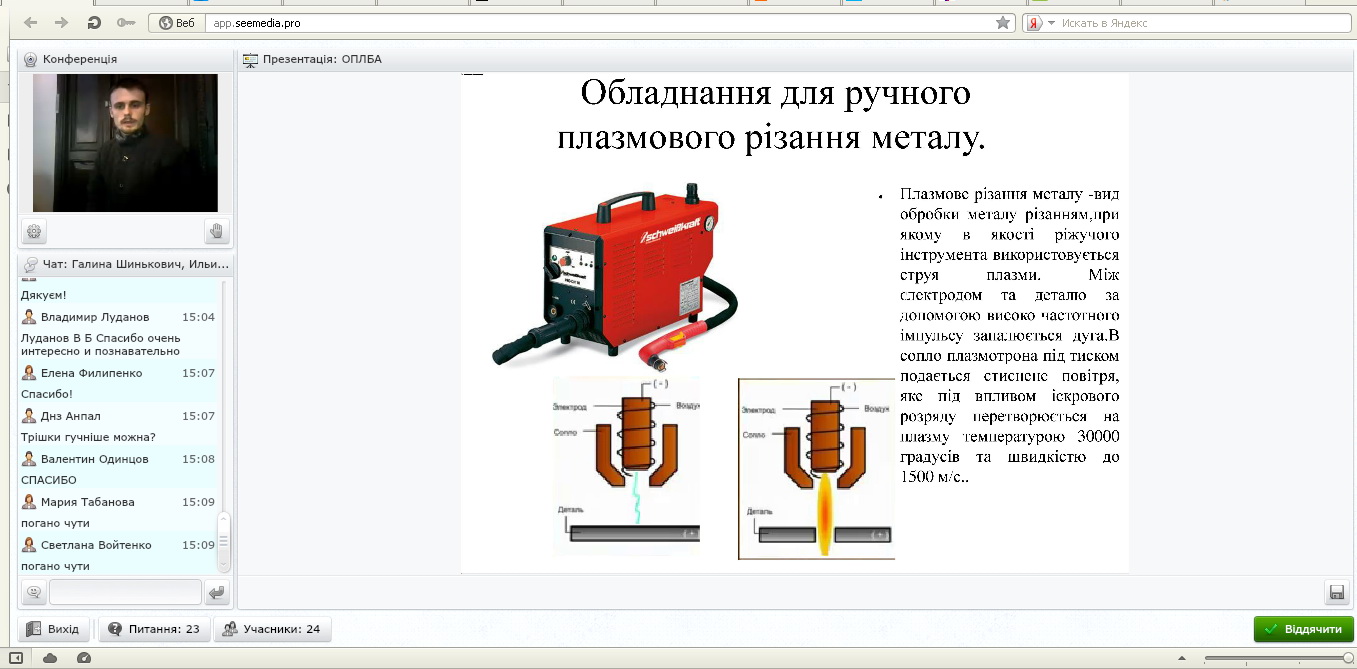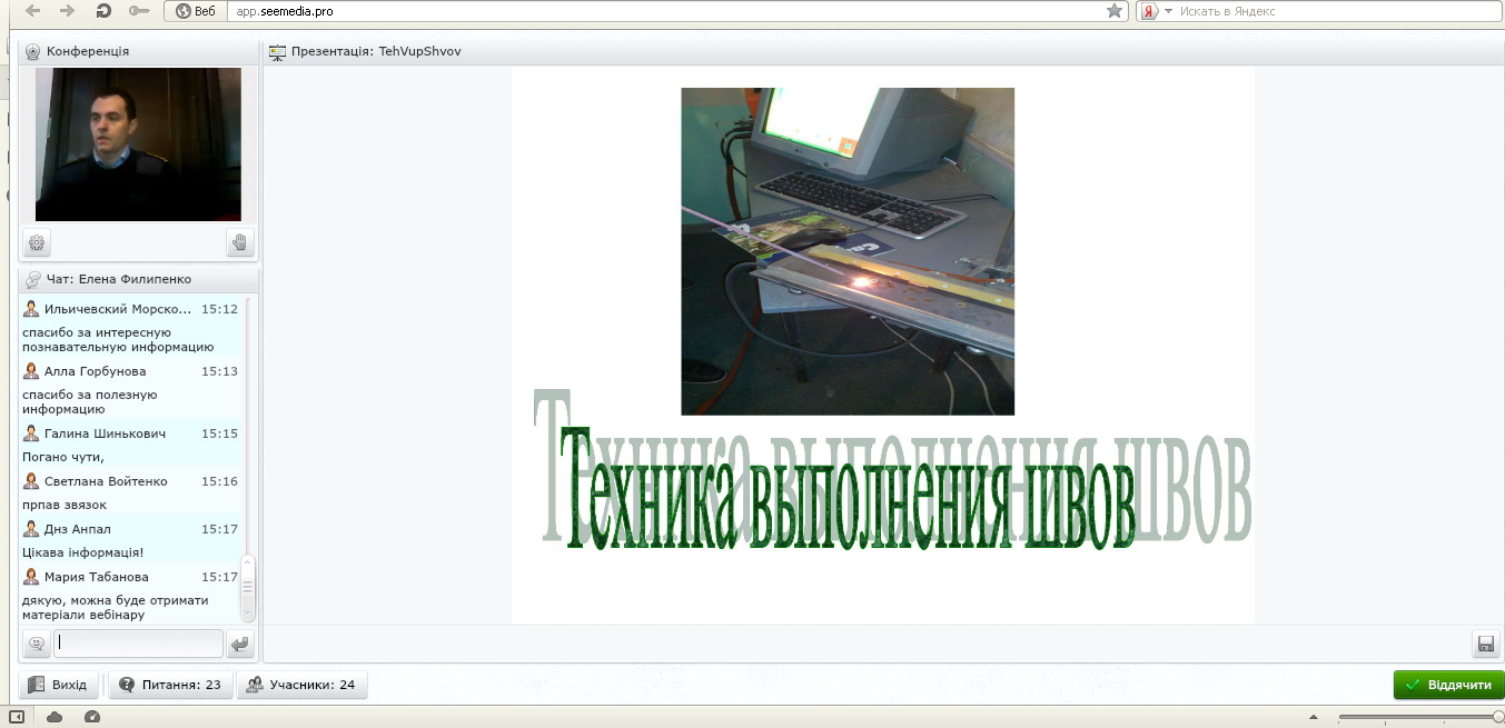 Чернушко С.Н. – викладач ДНЗ ОПЛМТ поділився досвідом використання тренажеру зварника ТСДС – 06М на уроках з предмету «Спеціальна технологія» професії «Електрозварник ручного зварювання», презентував методичну розробку уроку на тему: «Положення електрода, коливальні рухи електродом. Способи заповнення шва по довжині і перерізу. Закінчення шва».