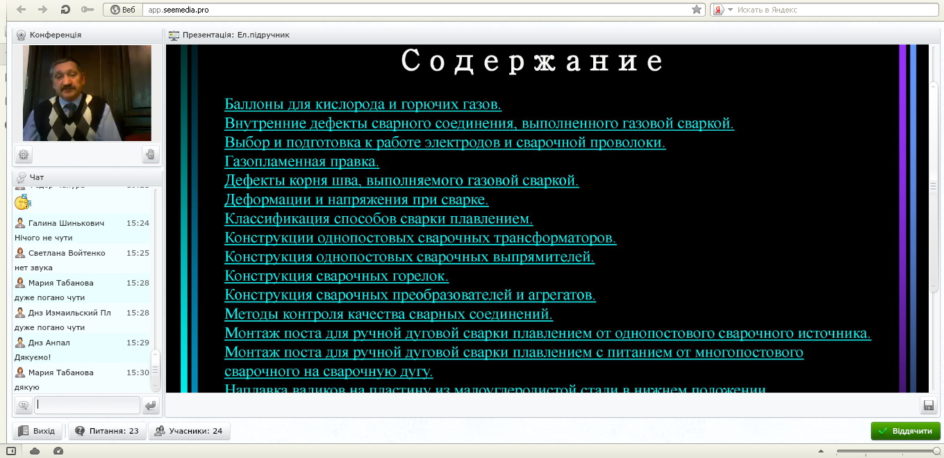 Короход В.О. – майстер виробничого навчання ДНЗ БДПБЛ здійснив демонстрацію відеоуроку виробничого навчання (вступний інструктаж) з професії «Електрогазозварник». Тема уроку: «Зварювання труб діаметром 25 мм у вертикальному положенні при товщині стінки 25мм». Присутні обмінялись думками щодо недоліків та переваг продемонстрованої методики проведення вступного інструктажу.