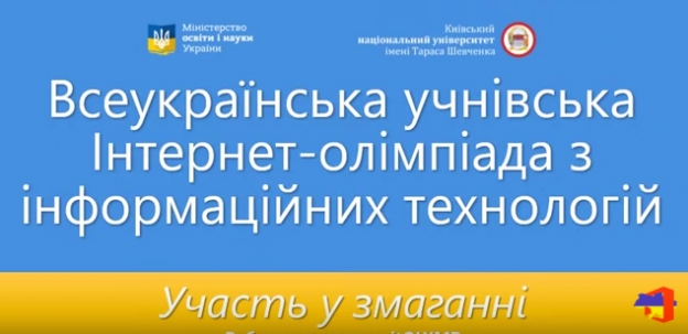 На базі Київського національного університету імені Тараса Шевченка відповідно до наказу Міністерства освіти і науки України № 650 від 19 червня 2015 року розпочинається реєстрація учасників Всеукраїнської учнівської інтернет-олімпіади з інформаційних технологій. До участі в змаганні запрошуються учні 9-11 класів загальноосвітніх і професійно-технічних закладів України. |