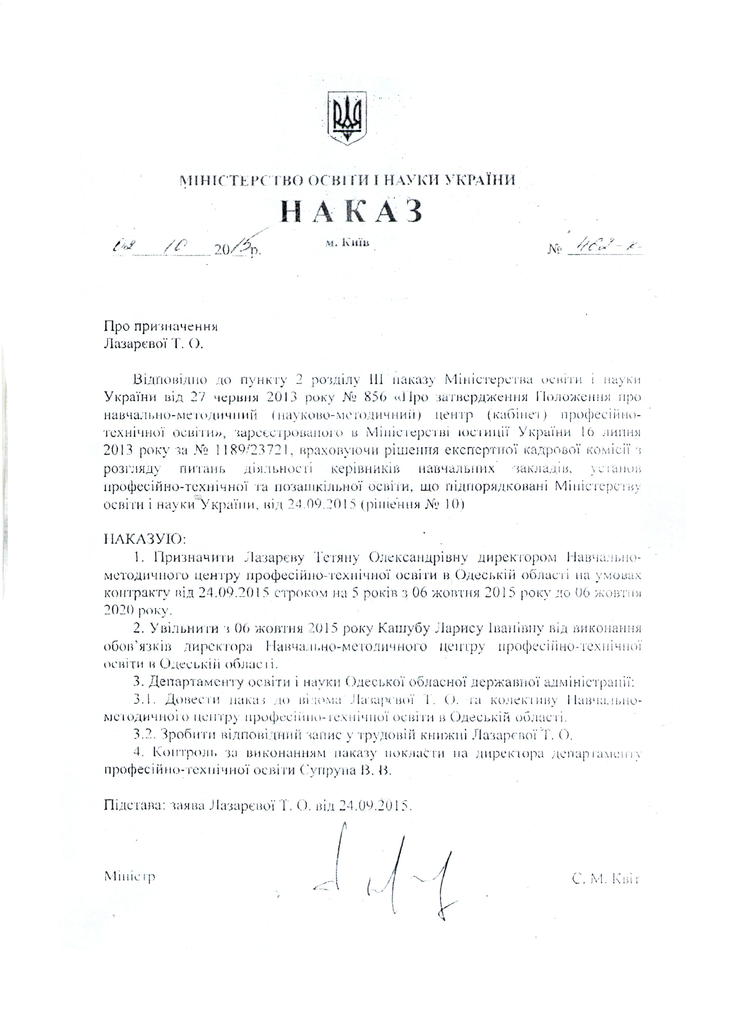 Згідно наказу Міністерства освіти і науки України від 02.10.2015 р. № 462-к директором Навчально-методичного центру професійно-технічної освіти в Одеській області призначено Т.О. Лазарєву.