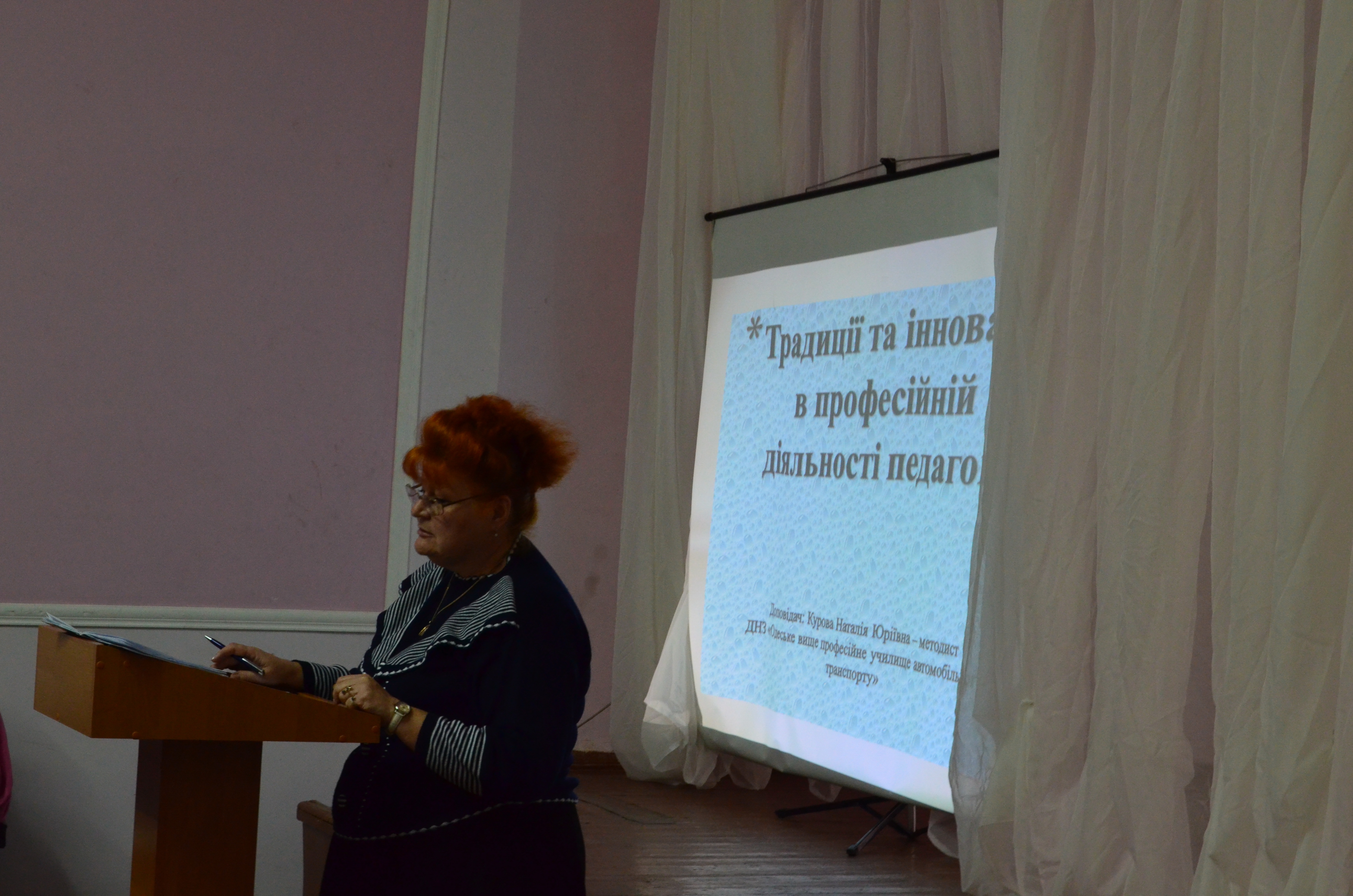 Методист ДНЗ «Одеське вище професійне училище автомобільного транспорту» Н.Ю. Куроваразом з викладачем С.В. Лапіним поділилися досвідом щодо традицій та інновацій в професійній діяльності педагога, продемонстрували свої напрацювання з питань впровадження інноваційних технологій в навчально-виробничий процес.