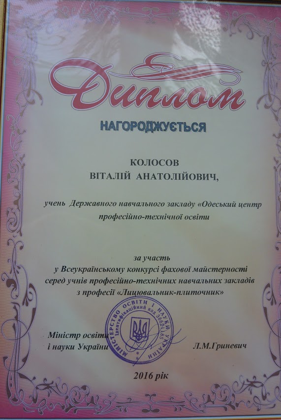 За результатами конкурсу Колосов Віталій отримав диплом учасника ІІІ етапу Всеукраїнського конкурсу фахової майстерності серед учнів професійно-технічних навчальних закладів з професії «Лицювальник-плиточник».