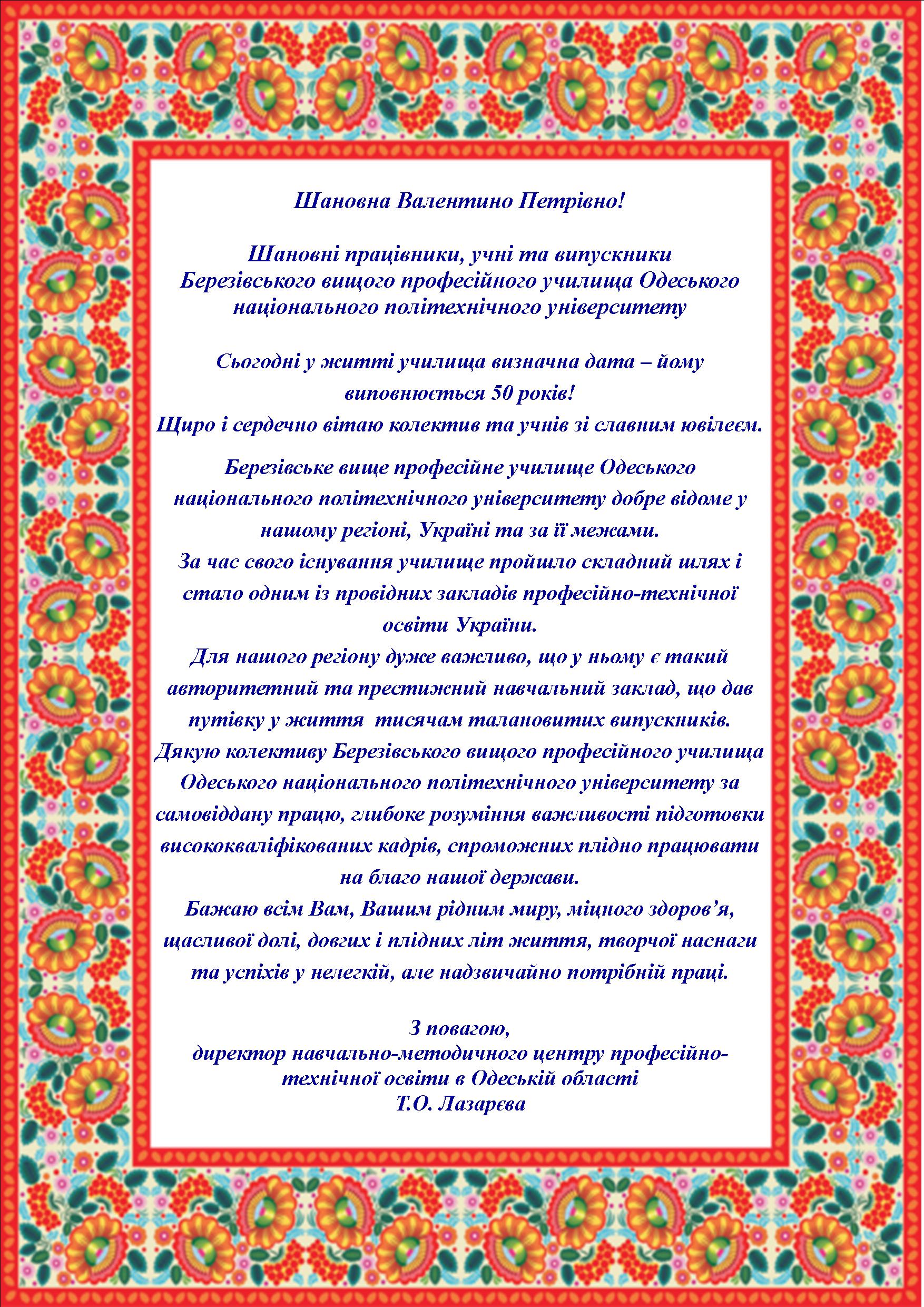 Вітання колективу Березівського вищого професійного училища Одеського національного політехнічного університету
